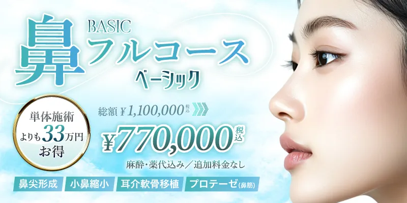 当院では、わかりやすくベーシックな鼻フルコースと色々選べるプレミアムな鼻フルコース、そして忘れ鼻形成という特殊な鼻フルコースの3つの鼻フルメニューから選んでいただくことが可能です。